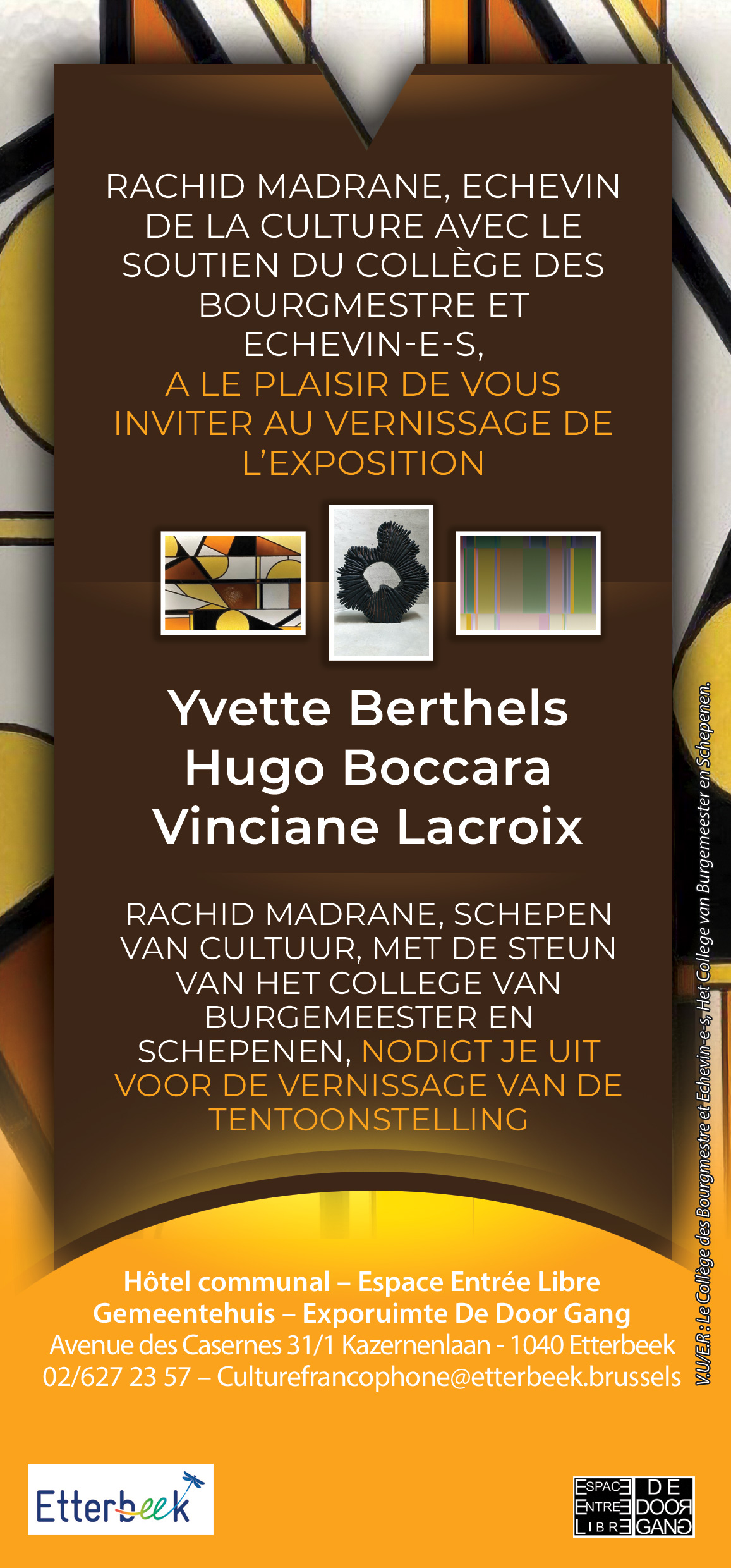 I am participating in a group exhibition with stained-glass artist Yvette Berthels and sculptor Hugo Boccara. The exhibition takes place at the Etterbeek Town Hall from 11/12/2025 to 5/01/2026, open from 8 am to 4 pm (until 7 pm on Tuesdays). In addition to the new series of Chromageneses, you will also see those exhibited at the Sofitel Hotel in 2024.